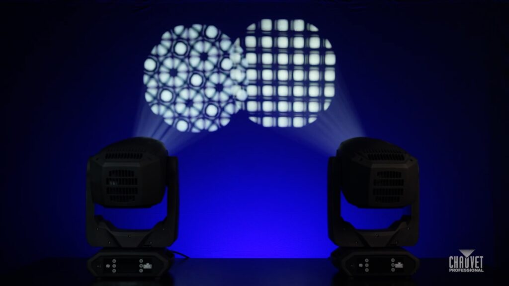 Dropping in a stacked gobo effect (rotating gobo + static gobo) demonstrates how choosing to focus on the static gobo vs rotating gobo results in different looks.